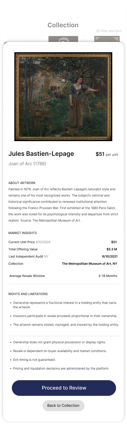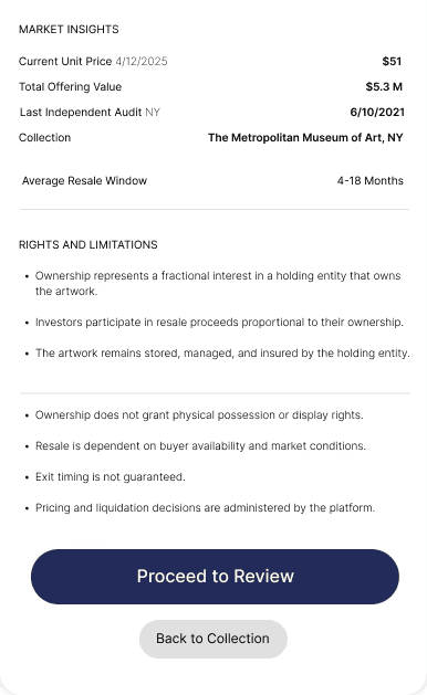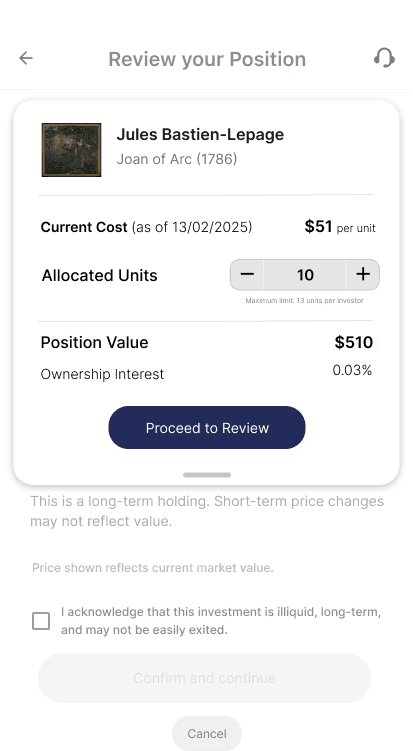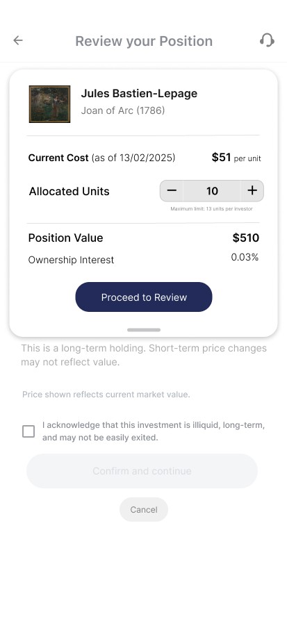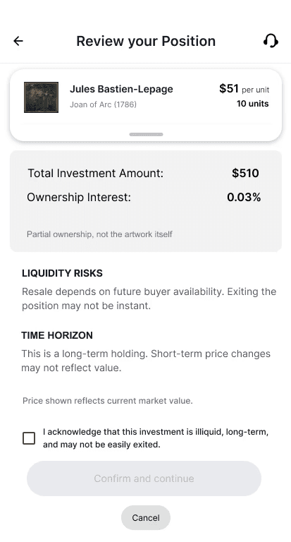 Users overlooked liquidity and ownership constraints when artwork details, commitment actions, and unit selection were combined on the same screen.